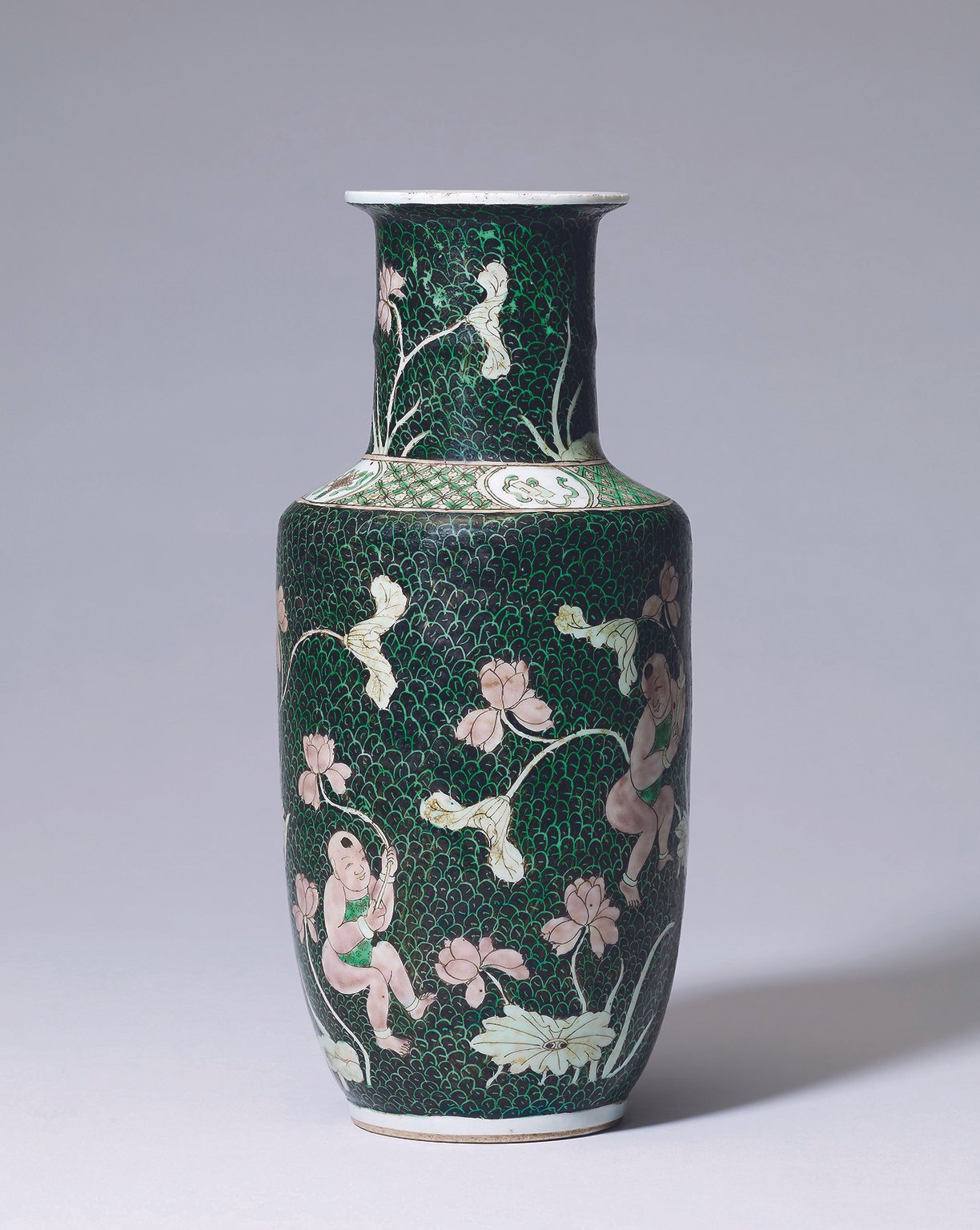 6183 清代 大明成化年製款 墨地素三彩嬰戲蓮紋瓶