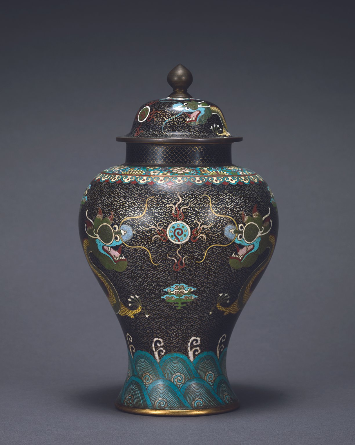 6185 清晚期 掐絲琺瑯黑地描金雲龍紋蓋罐