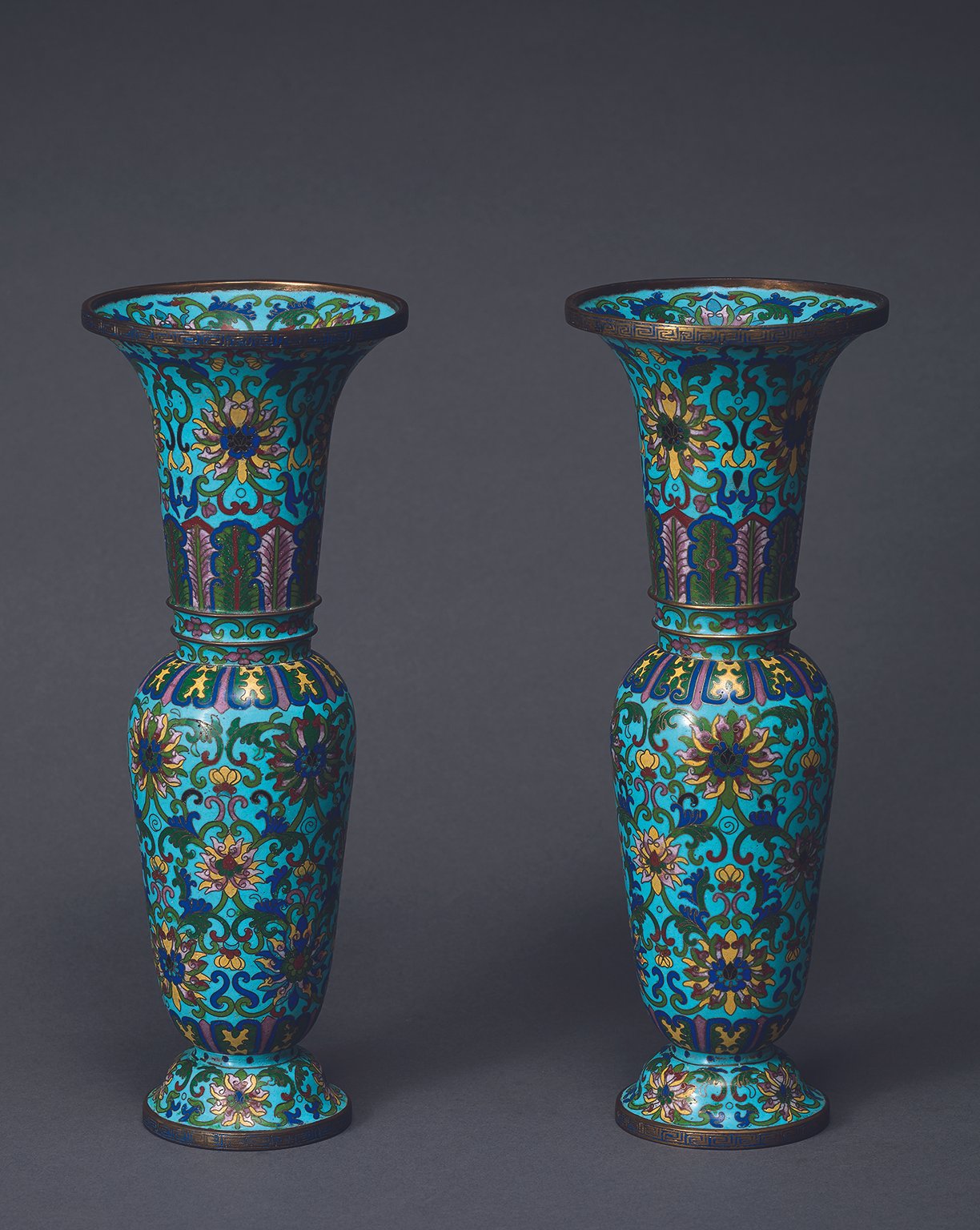 6186 清晚期 掐絲琺瑯天藍地纏枝蓮紋尊式瓶一對