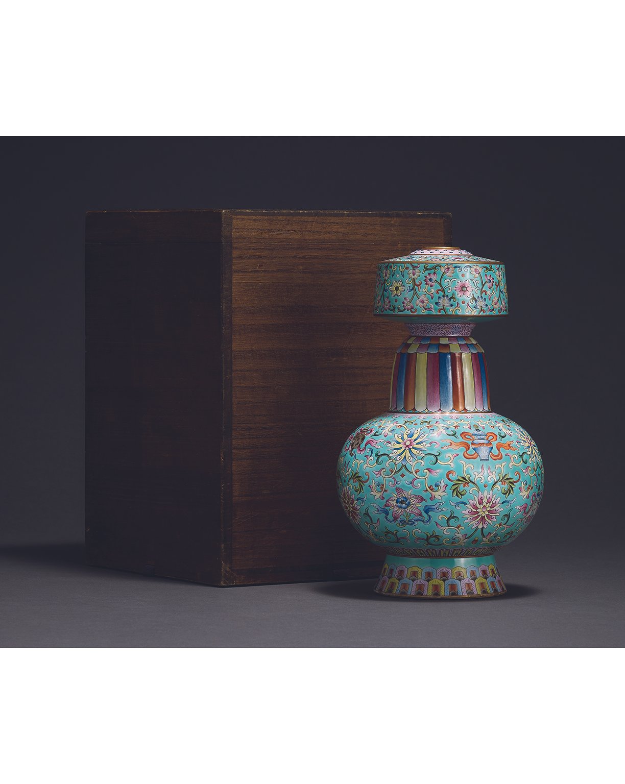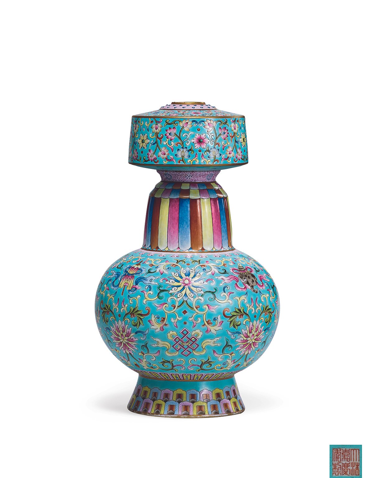 6187 清代 大清清嘉慶年製 松石綠地粉彩托八寶賁巴瓶