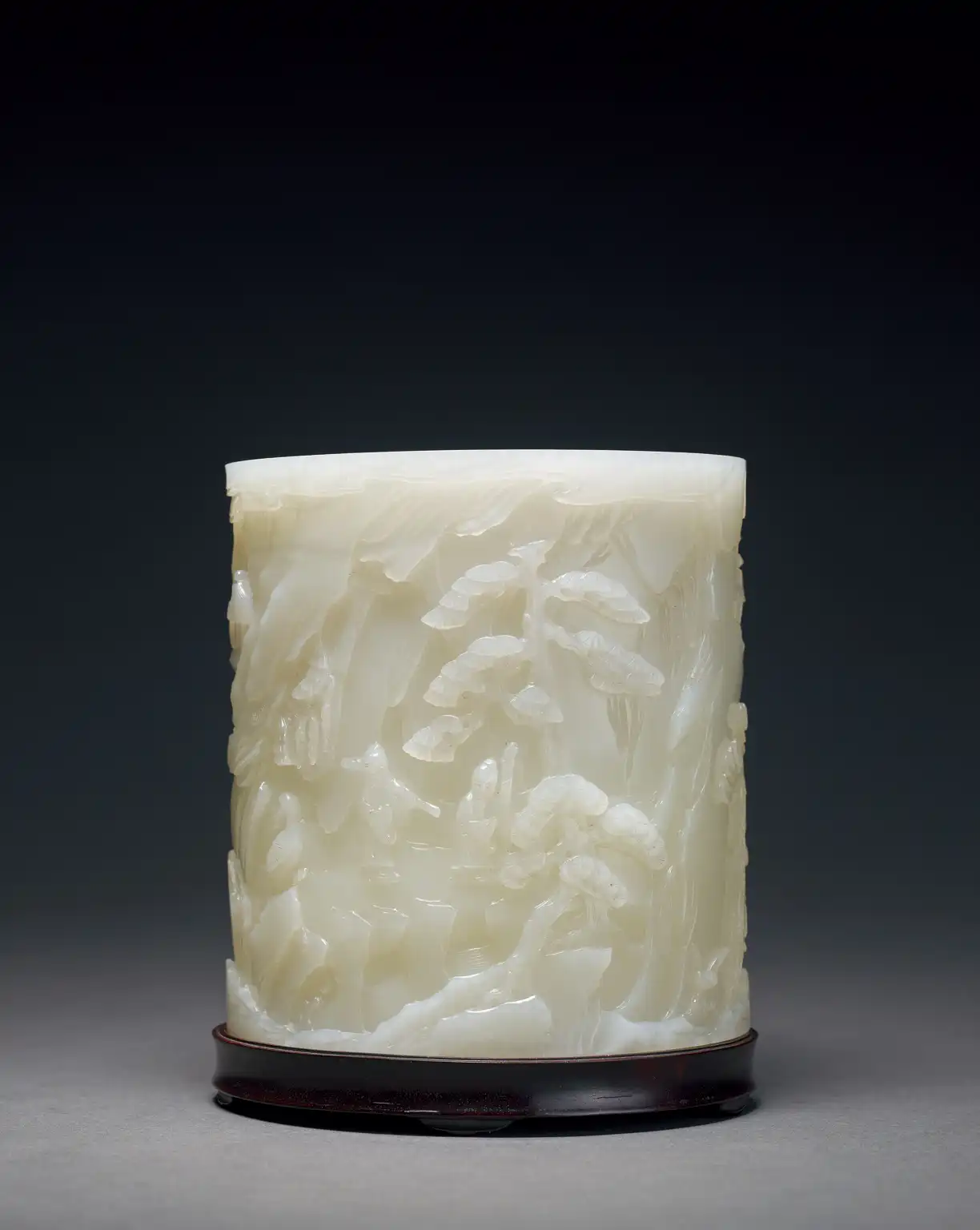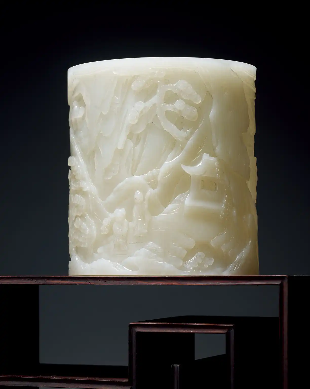 8032 清乾隆 和闐白玉雕高士仙山圖筆筒