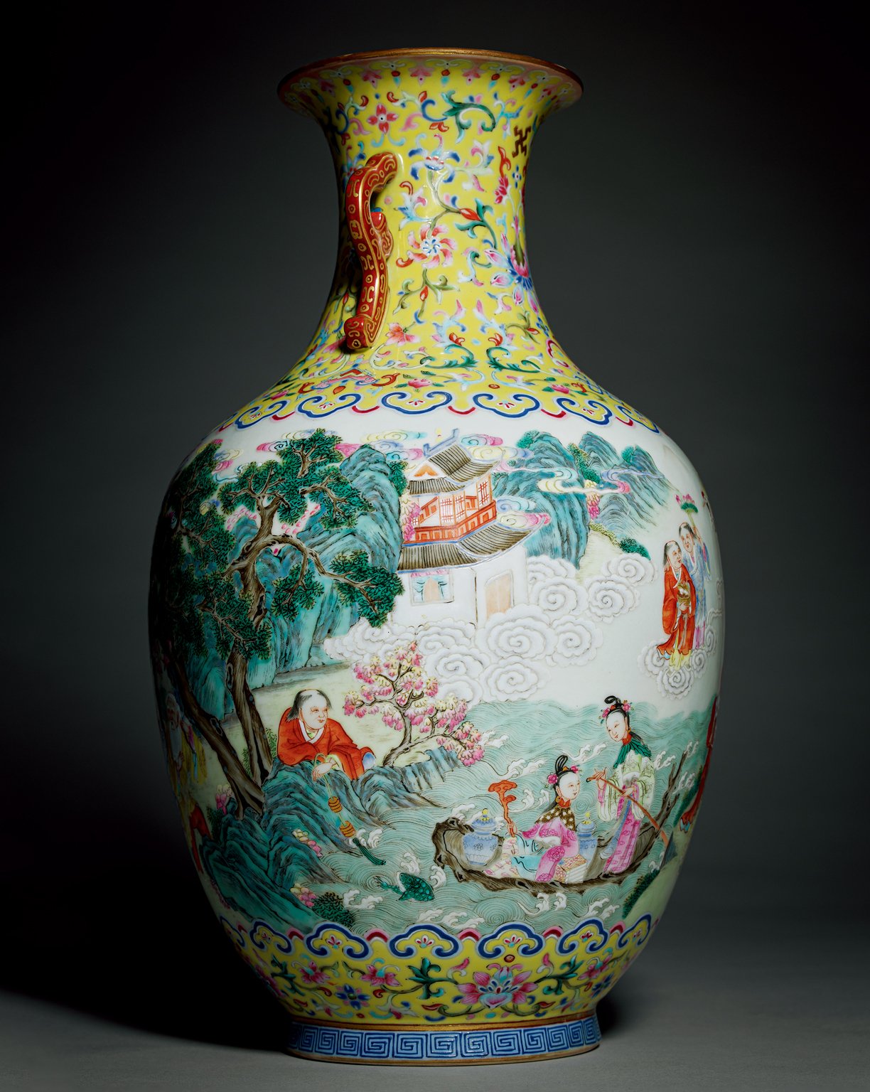 IMPERIAL YANGCAI YELLOW-GROUND DOUBLE-HANDLED VASE WITH 'IMMORTALS OFFERING LONGEVITY' DESIGN Jiaqing Period of Qing Dynasty