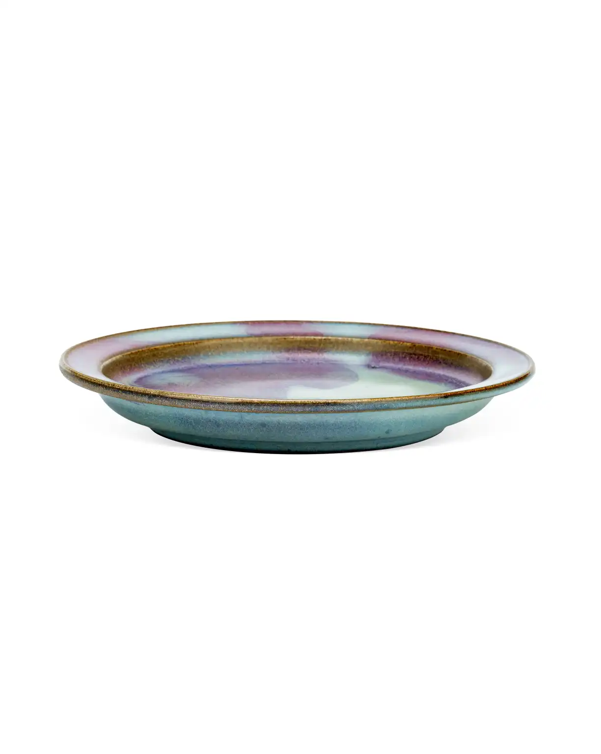 天藍釉瓷器,屬折沿盤,塑形工整,沿徑比例適中微侈。器腹極淺,底面平坦,器背微出圈足,其內顯支燒釘五,並凹一同心圓窪。正、反滿釉,盈潤輝澤流轉曲弧之間,並佐開片縱橫。基色淡雅,乃心曠神怡之青,沿之內、外及足面則現金棕緣。盤面浮多片玫瑰紫斑,團形各異,跨接沿、底,濃、暈隱於其間,紫、紅相輔相成為一體,並略透天青釉底,若雲影聚散晴空之下,尤其殊麗,將自然變數巧托於人為燒製,是鈞窯之典型名瓷。 作為宋代五大名窯之一,鈞窯除以其清巧的天青釉和月白釉聞名於世,其窯變技藝更是使後代宜鈞釉瓷等諸多官、民仿品皆爭相效法而望塵莫及的成就,在中國陶瓷史上獨樹一格。其作法是在釉料上塗抹一層含氧化銅的混合成分液,並以近攝氏一千三百度的高溫燒製,令釉水中的金屬元素發生還原反應,兩種釉料融合為一,出窯時便可產生「入窯一色,出窯萬彩」的藍釉紫斑成色。按這種燒製技術除仰賴一定的隨機性,更取決於人為掌控,包括製備、刷液、控火等一系列程序皆至關重要,方能得到件件都是獨一無二之鈞瓷。 而盤、碗、洗一類器形因尤可彰其鈞瓷之窯變,故成為當今文物市場相對重視之類。其中折沿盤是鈞窯盤器主流之一,同形器無論宋、金、元三代皆有所見,當前已寥若晨星,連未生窯變者也已價值連城。就此器言,其施釉較元代製品顯呈勻整,紫斑分布如雲霧自現,表澤亦光亮飽滿,且藉支釘而非墊餅燒成,較可能屬北宋或金代之遺存。與此器同承支釘燒製且被定年至宋、金者,可舉北京故宮和大英博物館各一件為例。