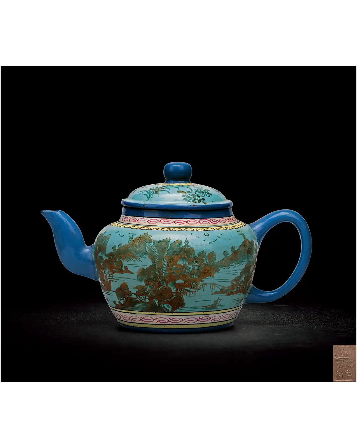 紫泥質,全器滿加粉彩,底、內露胎,釉澤潤亮。體近甕形壺,亦存粉彩與琺瑯彩瓷制之影:圈鈕,壓蓋微拱,短頸,弧肩,腹斜收近直,下凹臥足,狀若瓦缸。前伸三彎嘴,折曲遒勁,後接正耳,流線端莊。鈕、頸、足緣、嘴、耳施天藍釉,餘處則以青釉為地,上施描金紋飾:蓋面環花葉五株,器側則繪全景山水圖,其棧橋、蓊蔭、群巖、亭臺、飛鳥、旭日皆秀麗如詩境,不遜水墨之體;又題篆書金詩二句,是為「洞庭西望楚江分,水盡南天不見雲/名水」,出自唐‧李白《陪族叔刑部侍郎曄及中書賈舍人至遊洞庭五首‧其一》,並於緣處環白地紅彩和黃如意錦紋。器底印天圓地方章,分「荊溪」上橢和「邵元祥製」下矩二部。既彰清瓷麗風,亦含紫金之樸緻,乃日益珍罕之紫砂加彩器。