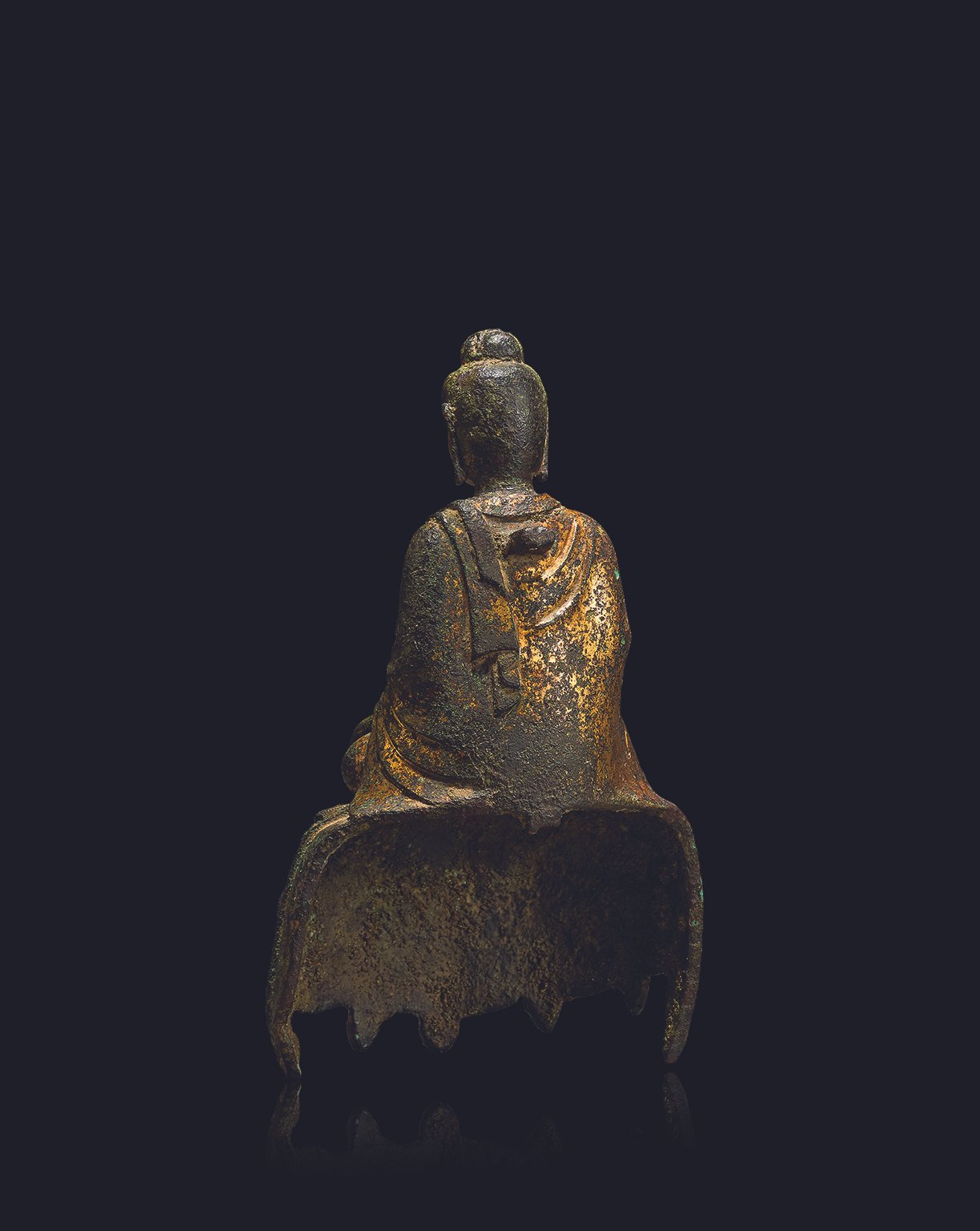 明而富重量感,既保留盛唐雄渾飽滿之量體,又漸現五代至早宋寫意化的線條處理。身軀比例沉穩端嚴,胸腹轉折以柔和弧線過渡,整體呈現靜穆而莊重的審美氣質。佛像鎏金厚重,於手、膝等觸手部位,與長期供養,帶有些把持摩拭遺痕,背部有一榫座。
