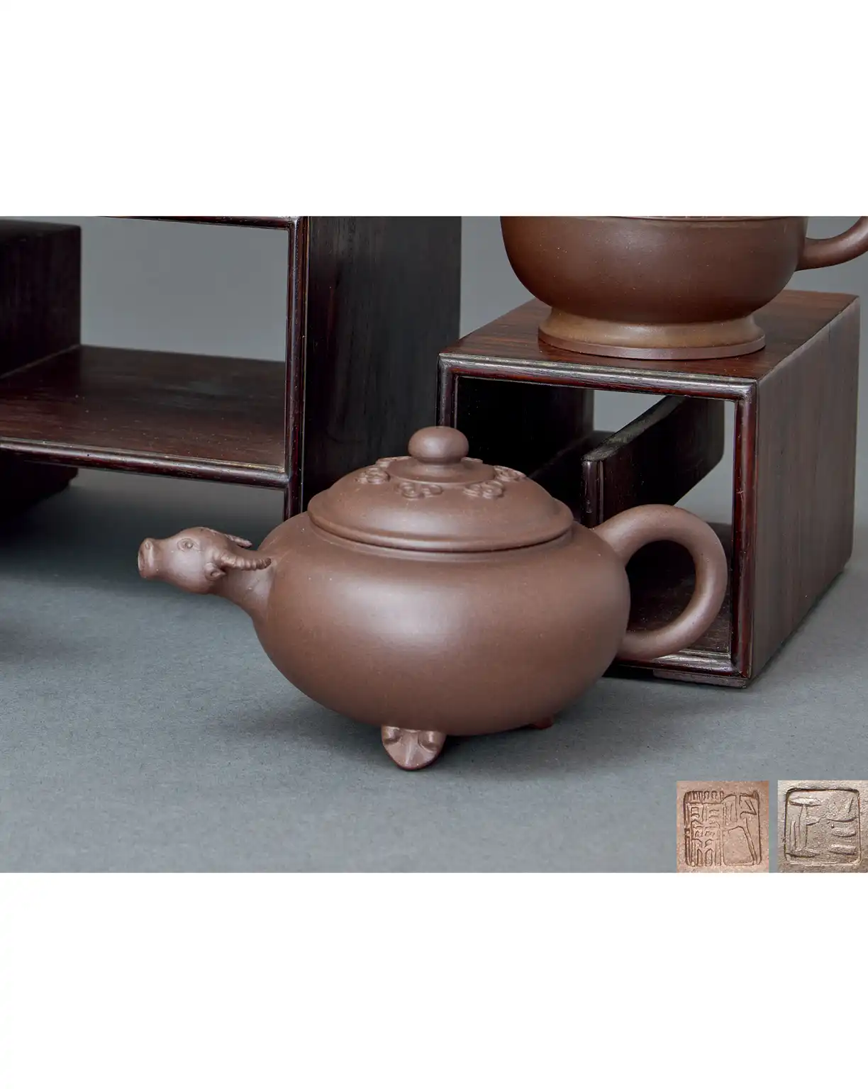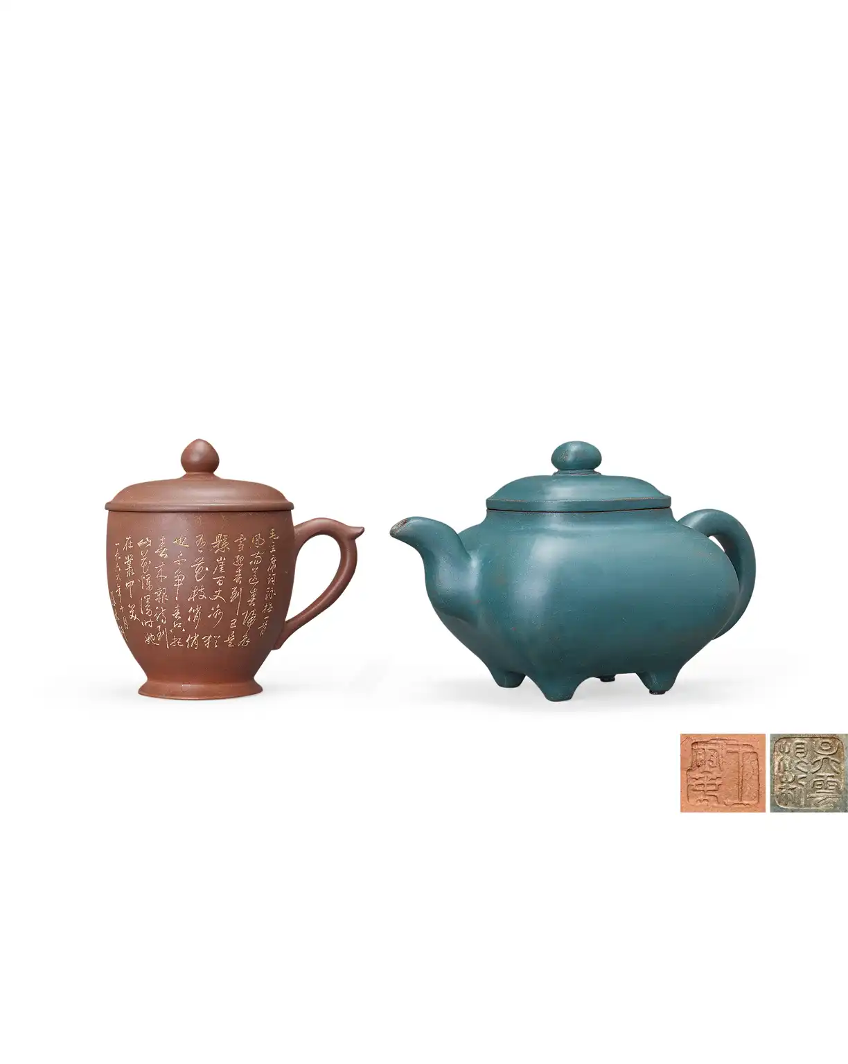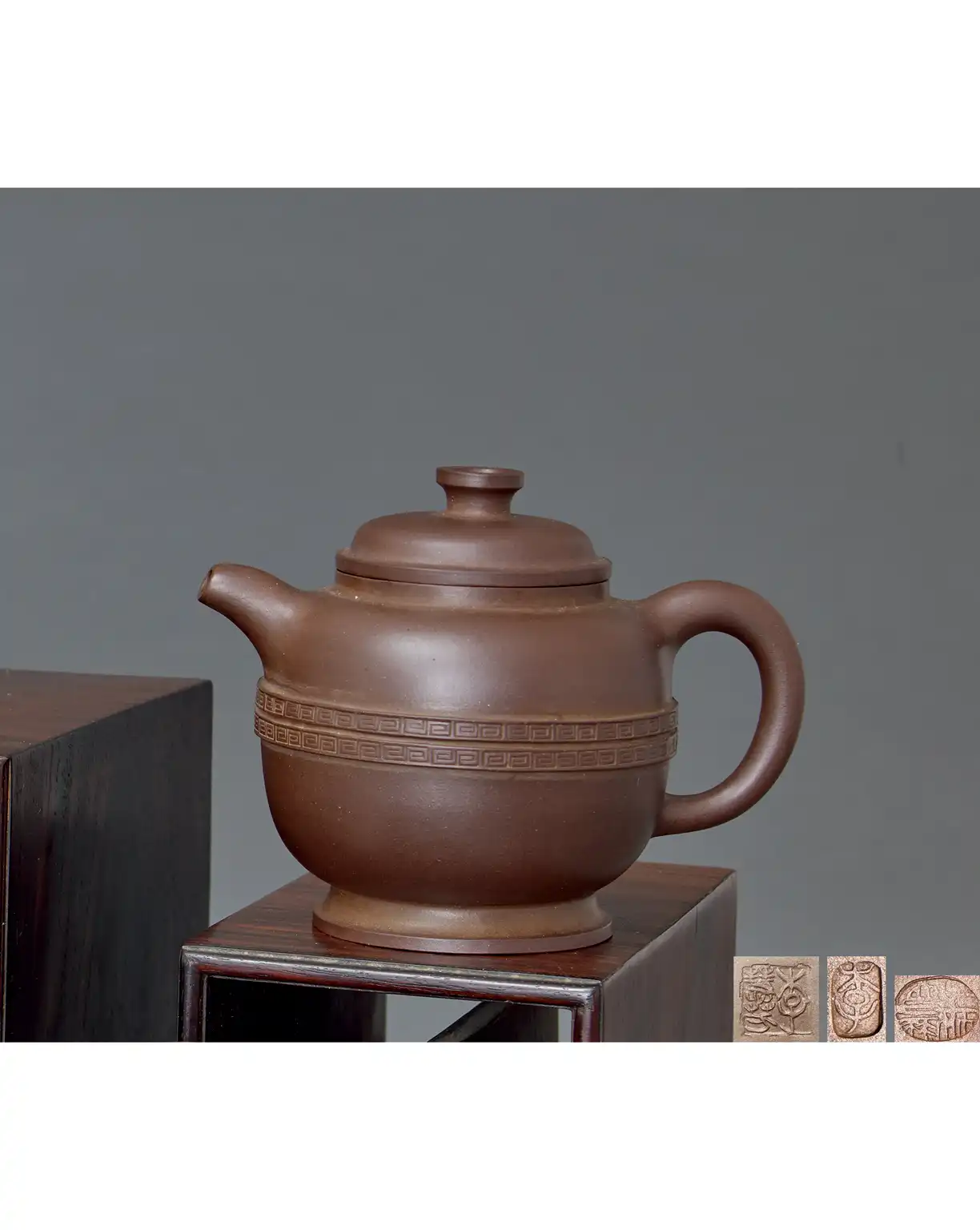 9087 民初 王寅春製 幹部杯/吳雲根製 紫泥粉漿四方傳爐