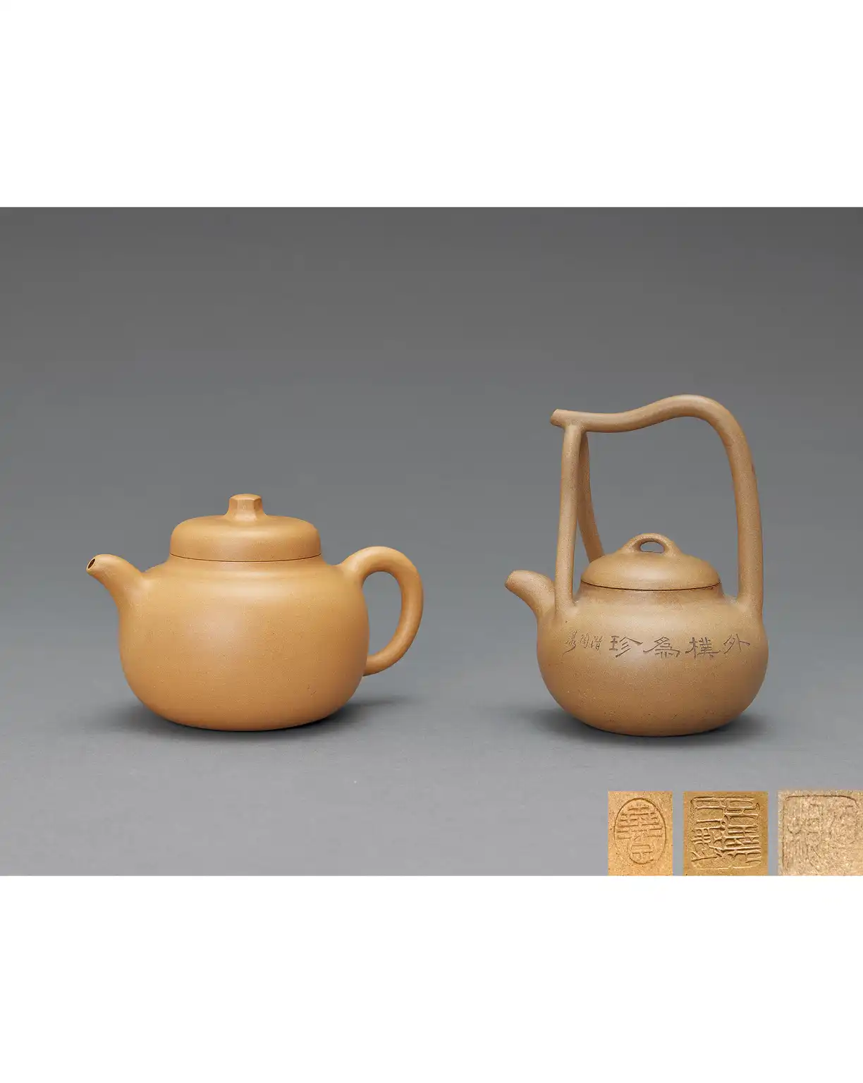 9092 民初 呂堯臣製 段泥得福壺/德根製 潛陶刻 三叉提樑壺