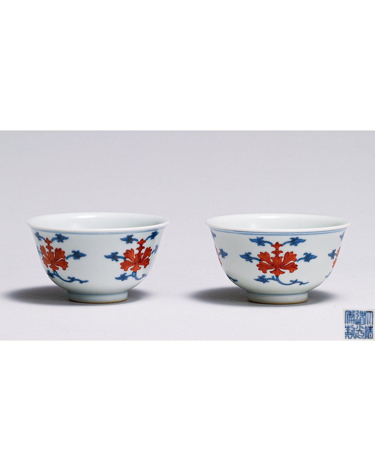 1069 清道光 大清道光年製款 青花礬紅斷枝蓮紋杯一對