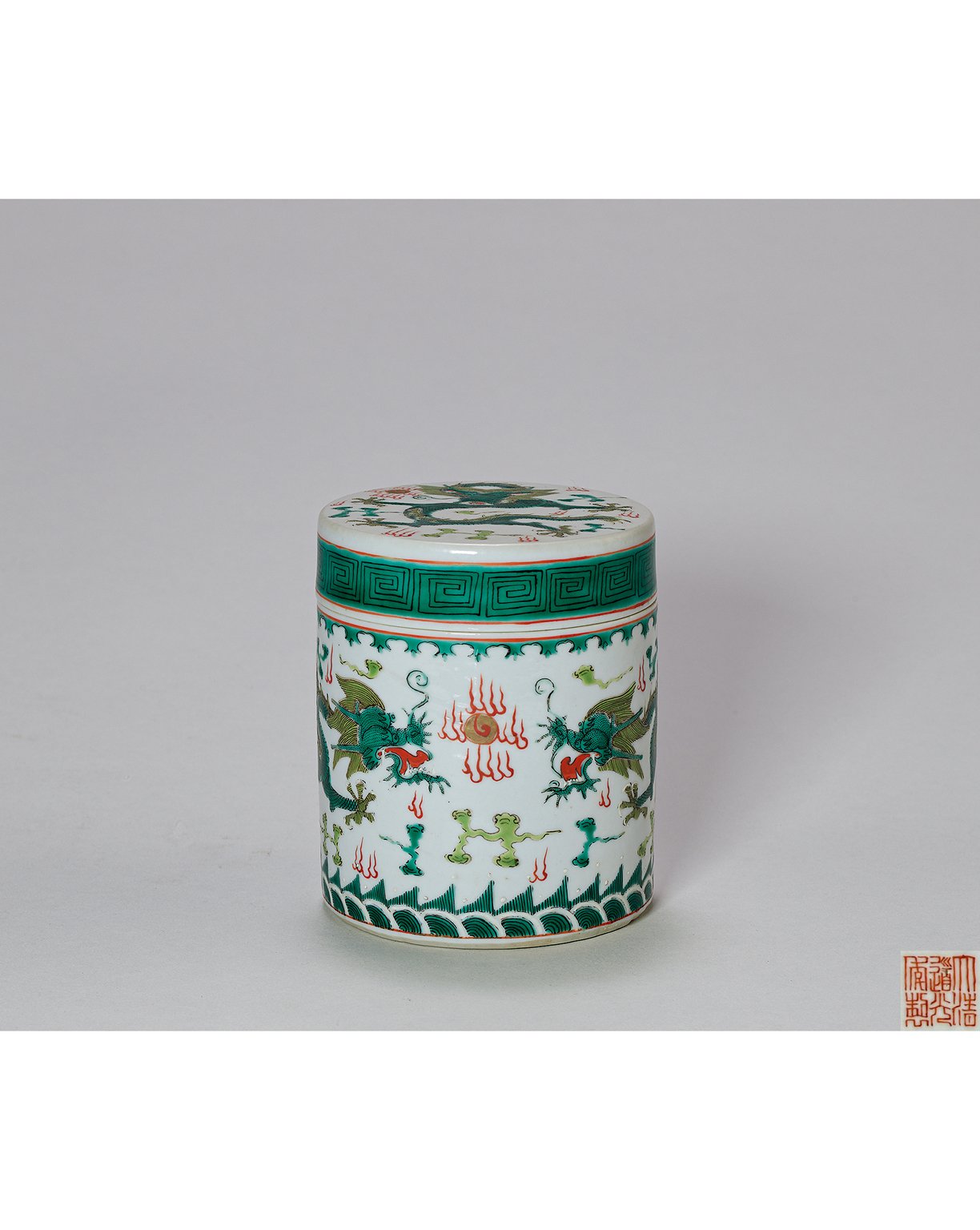 1070 清代 大清道光年製款 五彩綠龍搶珠紋蓋罐