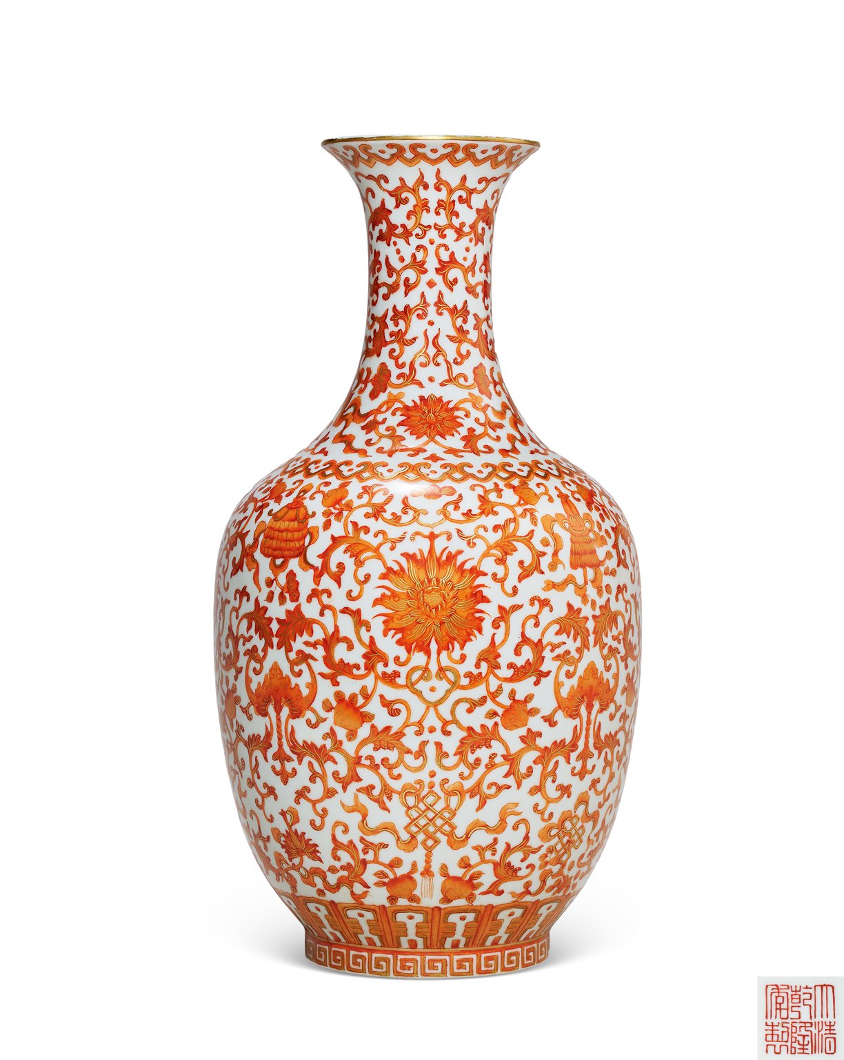 1082 清代 大清乾隆年製款 珊瑚紅描金四寶紋瓶