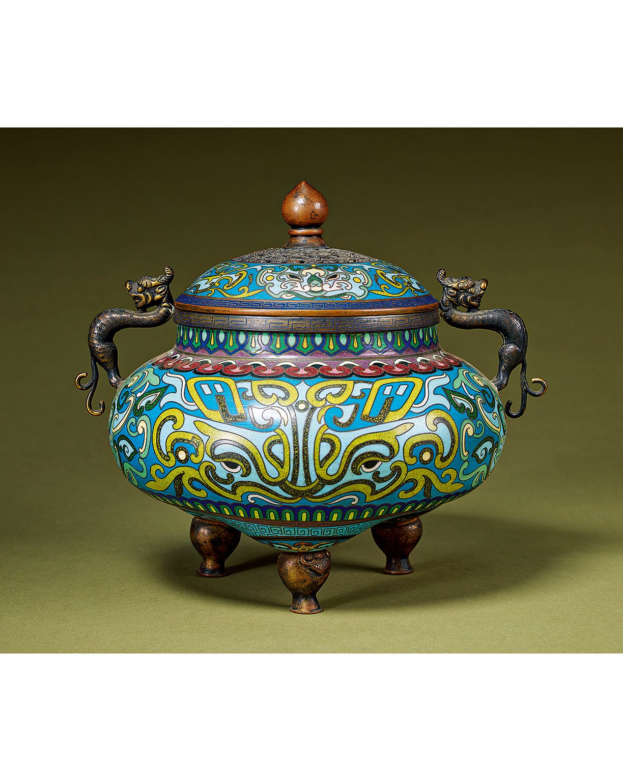 1201 清代 銅掐絲琺瑯饕餮紋寶珠鈕熏爐